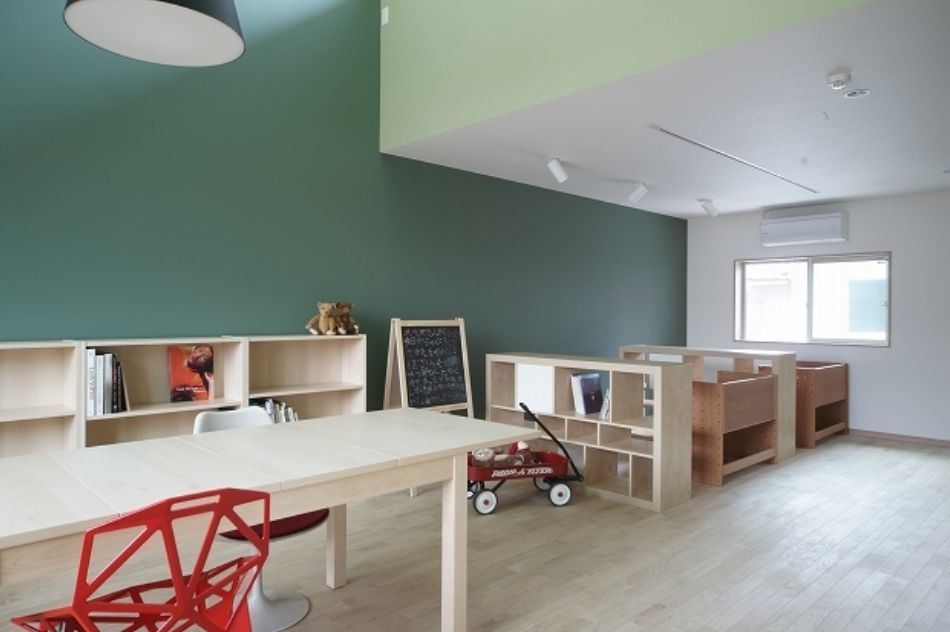 子世帯となる2階は、個室を設けずに大きな1LDKとして計画し、リビングスペースの中で道路側となる天井高の高い場所は、家族が共有するスペースとして想定しています。中庭側の天井の低い場所は、子供たちが机や本棚といった家具により、フレキシブルに断続する空間が形成出来るように。
