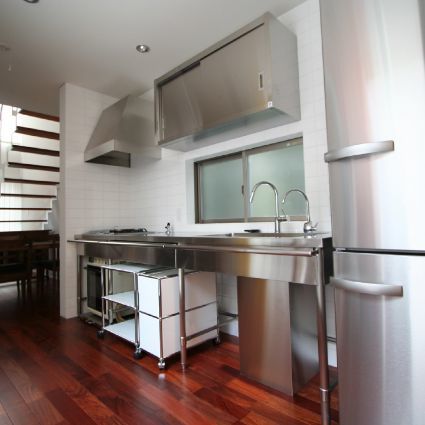また、中庭を外部空間として独立させるのでは無く、内部との一体的な利用が出来るように、リビングを全開口サッシとし連続性をもたせています。加えて、室内の壁・天井を外壁と同様の吹付仕上とすることで、内と外といった境界線を曖昧にしています。