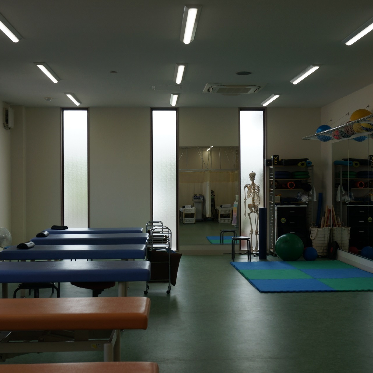 リハビリ室は人工芝という話もあったのですが、使い勝手などを考慮してグリーンのフロアシートとなりました。