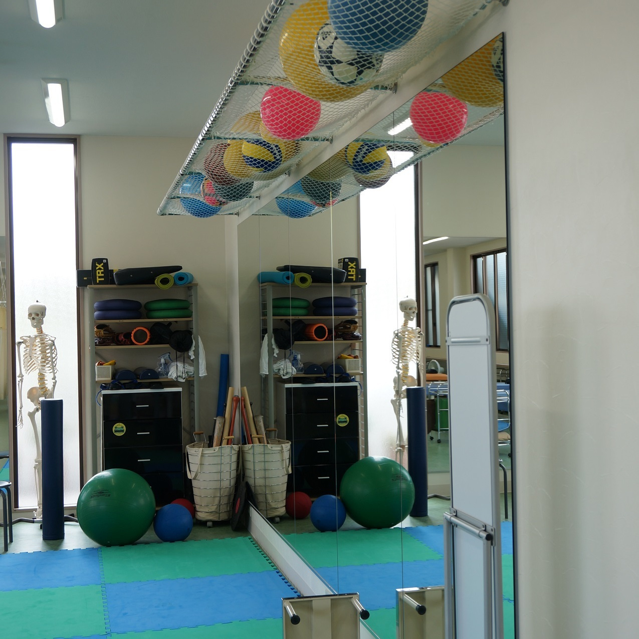 動きの確認が出来るように壁面一杯にミラーを設置し、上部にはリハビリで使うボールを収納するネットを設けています。