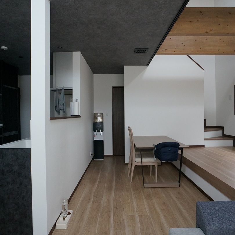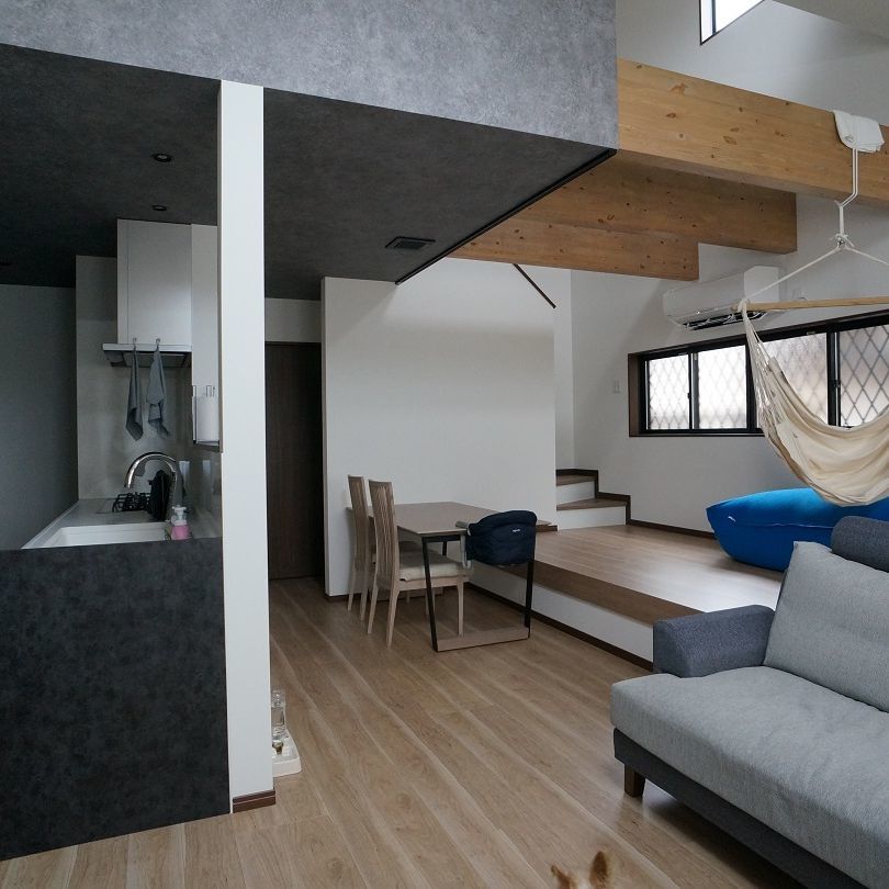 多くのご家族や友人が一堂に会せるようLDKは約22畳と少し広めに。LDKの一角をスタディスペースやハンモックスペースとし、常時家族が集う場所として計画しました。このスタディスペースとハンモックスペースは40㎝の小上がりとしてダイニングのベンチを兼ねており、この小上がりを利用して家具を配置することで、最長6m程のパーティースペースとして利用が出来ます。
