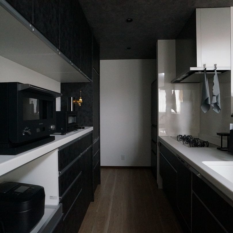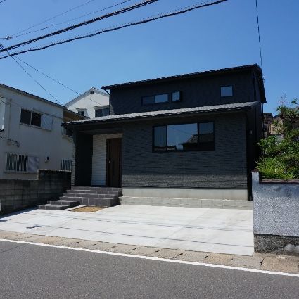 外壁は黒を基調としながら、玄関部分のみアクセントとして白にしています。