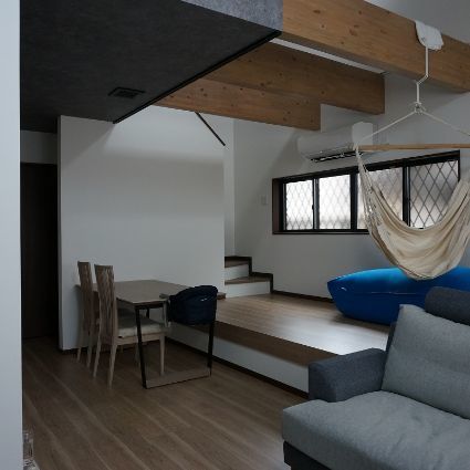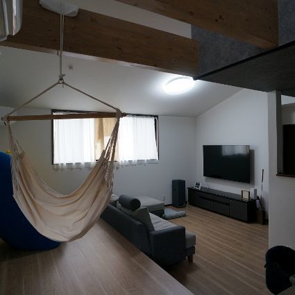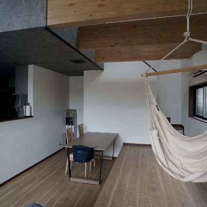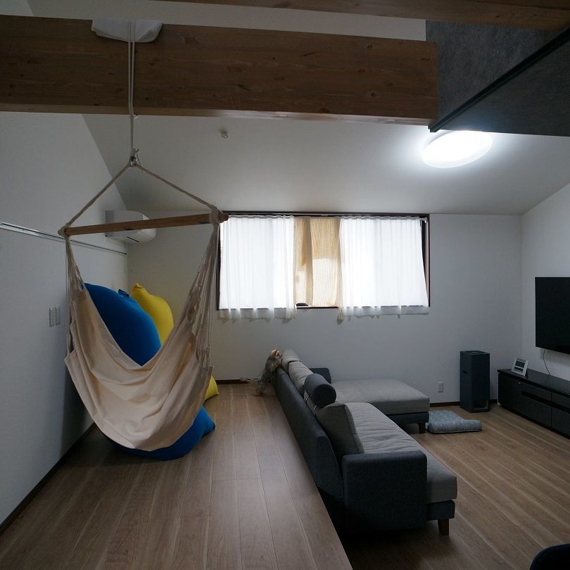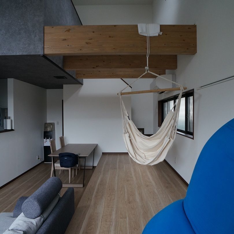天井にも変化を与えており、リビングやスタディスペースは2階がない平屋部分となる為、屋根に合わせて勾配天井。ハンモックスペースはハンモックをぶら下げる為、梁現しとした吹抜け空間。これらの採用により、広がりのある開放的な空間とするとともに、床だけでなく天井レベルにも変化を与えて、リズミカルな動きのある空間と構成としています。