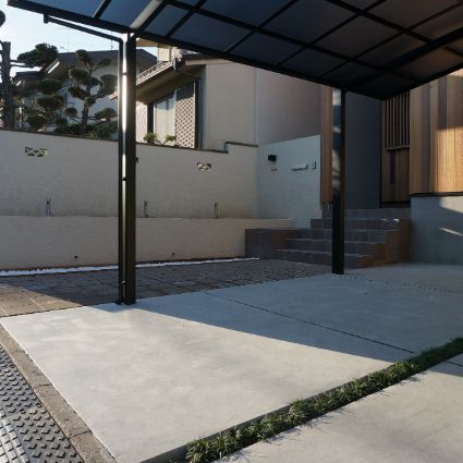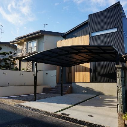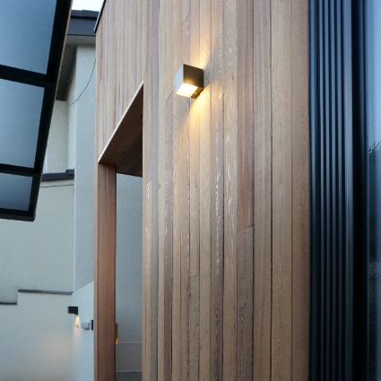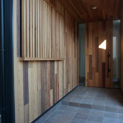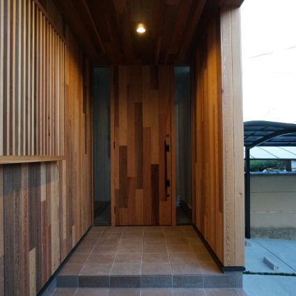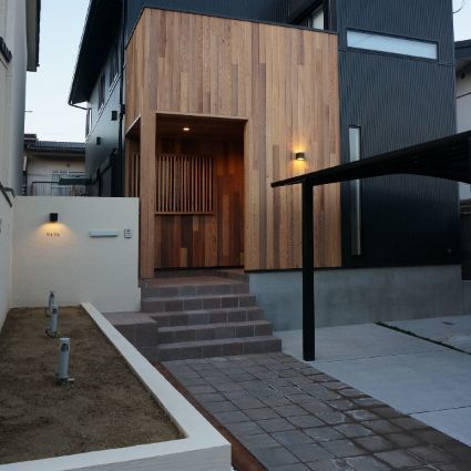外壁の一部とアプローチには無垢のレッドシダー材を用いて、サイディングだけでは淡白になってしまう外観に経年変化による味わいが出せるように計画。アプローチから玄関扉にも同様の材を用いて一体感のある質感とし、内外が緩やかにつながるデザインとなっております。