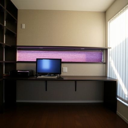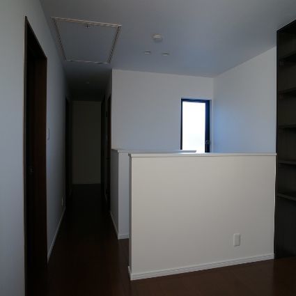 2階のホールはデスクと書棚を設けており、ご主人の書斎、時にはゲームコーナーに様変わり。バルコニーに隣接したこのスペースには、天井収納型の物干しを設置することで、急な雨や梅雨の時期の物干しスペースとしてもお使い頂けるよう考え、必要最低限の広さにゆとりを加える事でフレキシブルに活用できる空間とし、将来的には子供たちの遊び場や学習スペースとして、ご家族の成長に合わせて絶えず変化できるよう、考えさせて頂きました。