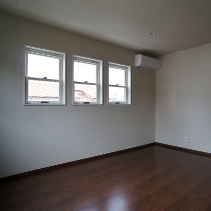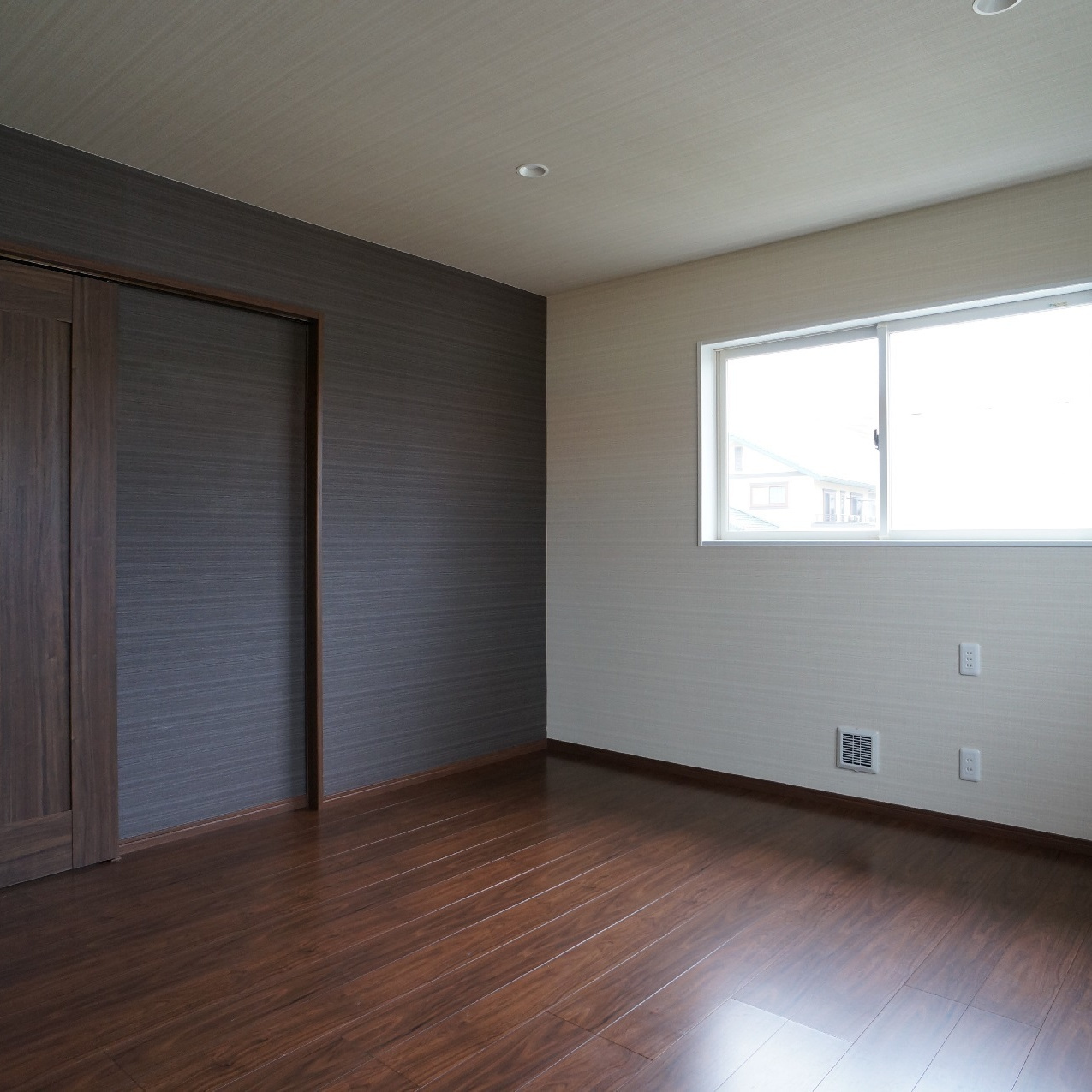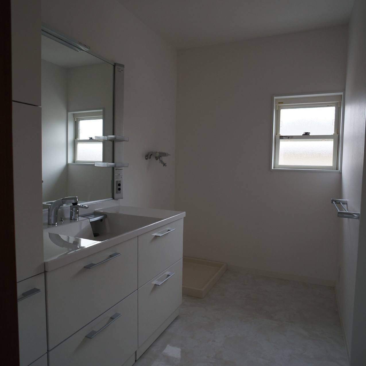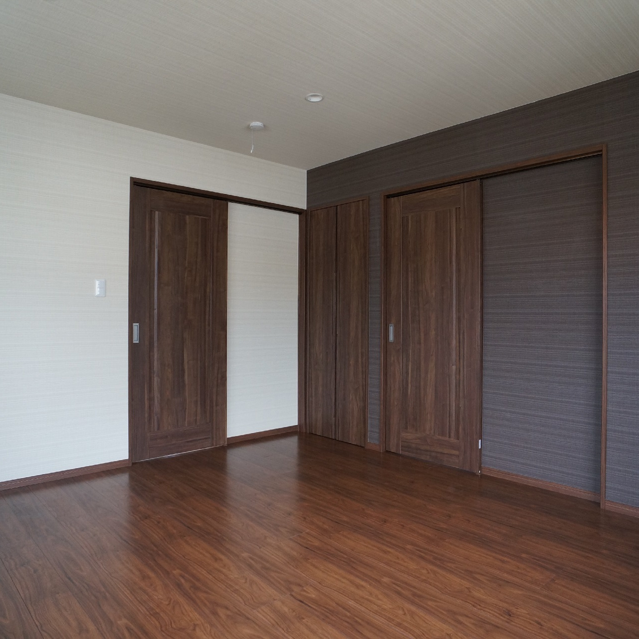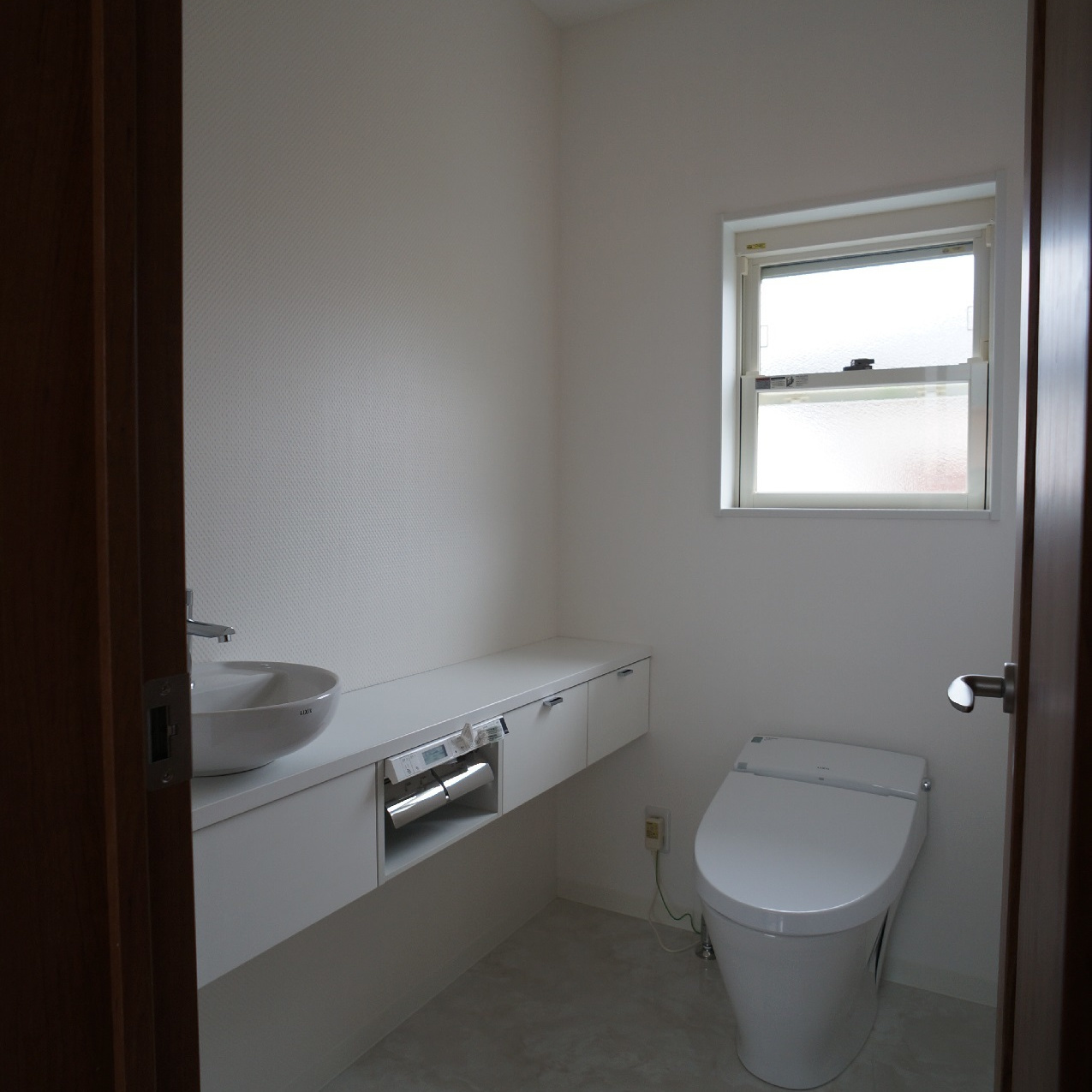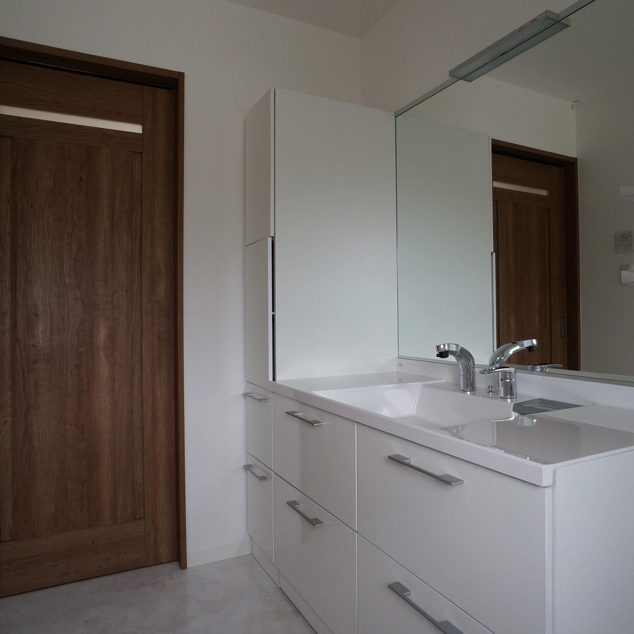 2階にはよりプライバシーを要求される寝室・浴室をまとめて配置し、寝室にはゆったりとしたウォークインクローゼットを設ける事で、季節物なども収納できるスペースに。配色は壁一面をベッドや鏡台と色調を揃えたダークブラウンとする事で、アクセントカラーとしての演出を行いながら寝室の落ち着いた雰囲気を演出しております。また、テラスを洗面室に隣接した位置に設ける事で、建物のファサードとしてのデザイン性だけではなく、家事動線の効率化も考慮させて頂きました。