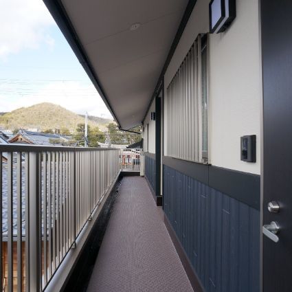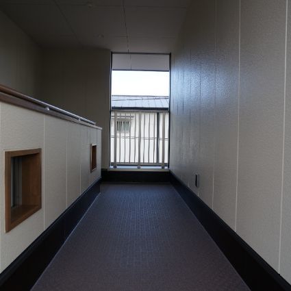 また、プライバシーへの配慮としては、道路側にバルコニーを設け、共用廊下をオーナー住居側設けるといった対応をしています。共用廊下には縦格子を設ける事で、視線が直接オーナー住居側へ向かないような仕掛けを施しています。