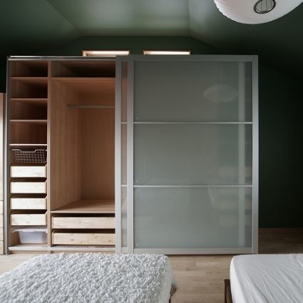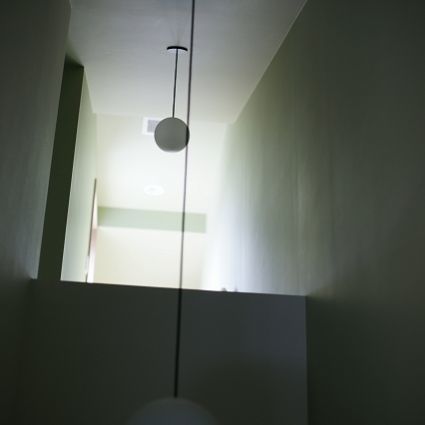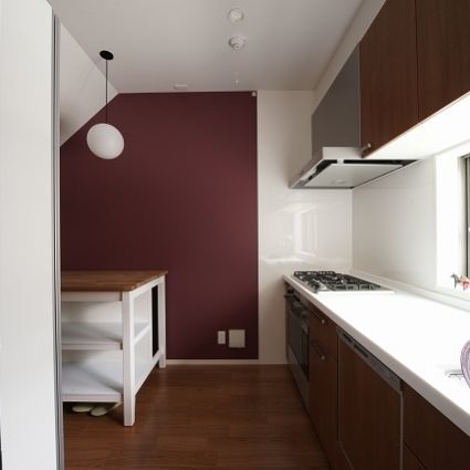 間口が狭く奥行きの長いウナギの寝床タイプの敷地であり、オープンな空間であるLDKを道路側に設け、敷地奥の静かな場所に寝室を設ける空間構成に。