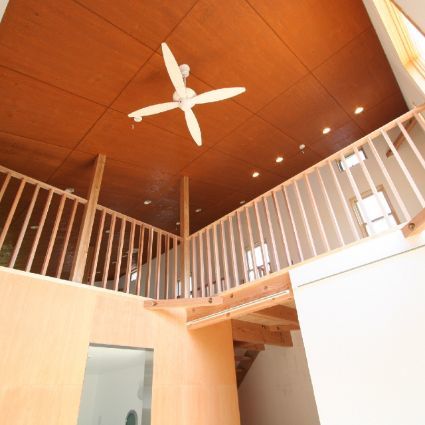 2階は完全にオープンな空間とし、家の端から端までが見通せる圧倒的な広がりを持っています。また、縦格子の手摺により、各領域の分節が認識できるようになっています。