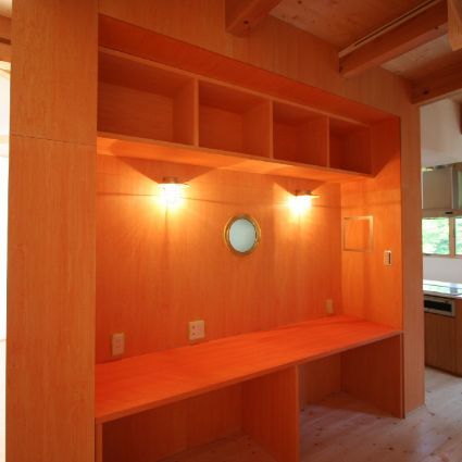 デスクスペースは玄関とLDKの間の階段スペースの脇に配置し、マリンランプと丸窓で演出。