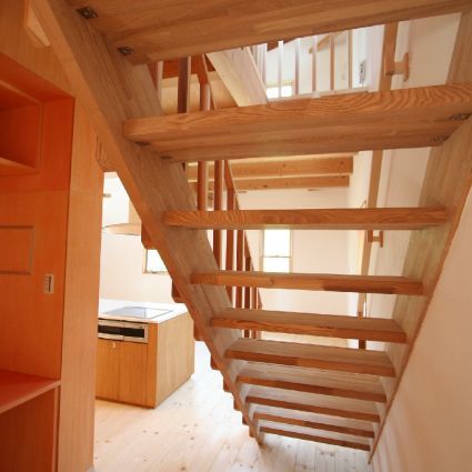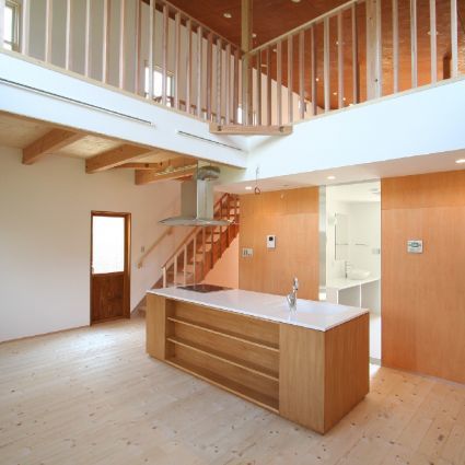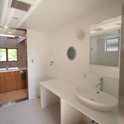 また、家の奥に設けたLDKは、玄関・サニタリーから見通せ、吹抜を介して2階へと繋がり、吹抜けを大きく設け、2階を縦格子による手摺で分節することで、平面的な狭さを立体的な広さで補っています。キッチンは人造大理石の天板にカラーシンクを組み込んでカラーを統一し、側板は木製として背面のサニタリー壁面と同化させ過剰な要素を削除。