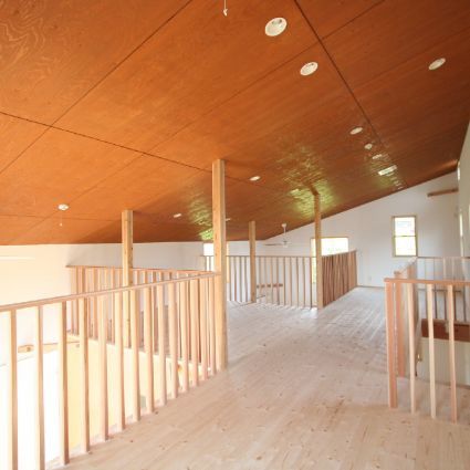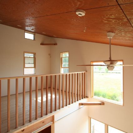 内部仕上げは、床材は38mmの無垢材を用いる事で、根太・下地を省き、そのまま1階天井仕上としています。壁はクライアントDIYによる左官仕上げとなっています。
