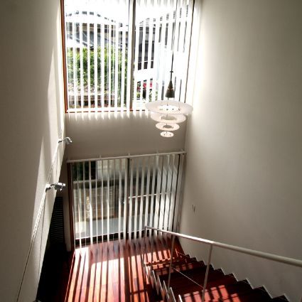 ファサードは、白壁のキューブに木格子の扉を付けたシンプルなフォルムとし、パブリックスペースから見える所は大きな開口部を設けず、外部に対し閉じた構成としています。しかし、完全に外部と断絶するのではなく、格子のスリットを通して内外がリンクすることで、外部と一定の繋がりを保ち断続するよう計画しています。