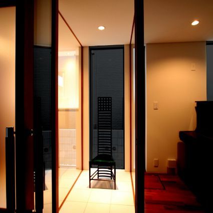 玄関は道路から直接アクセスするのでは無く、建物とはトーンを変えた焼杉板と御影石で構成した半屋外のアプローチを通り、一旦コアとなる中庭を経由するサイトプランとしています。アプローチを半屋外とし、更にトーンを変える事で、動線に陰影をつけて、中庭の明るさと空間の広がりを強調。各居室は中庭へ向けて開いたプランとし、中庭を介して互いの存在を感じることが出来るように、中庭側に床から天井までの大きな開口部を設け、求心力をもたせています。