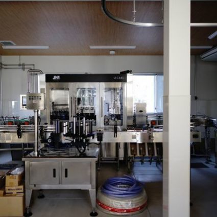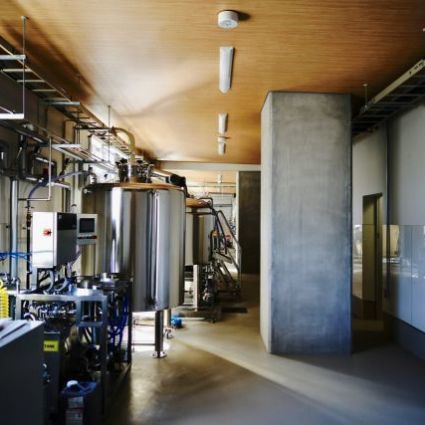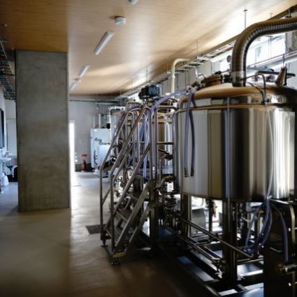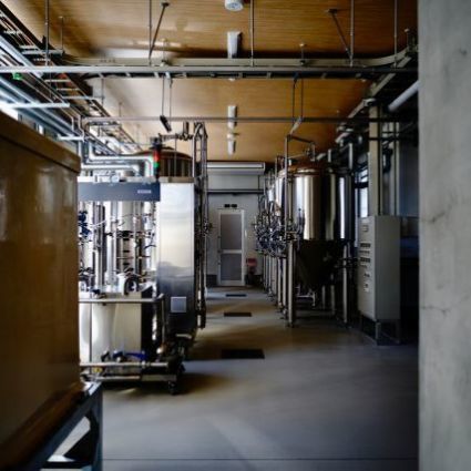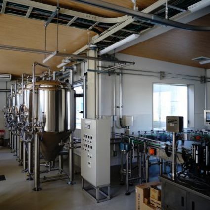 大きな窓を随所に設けており、熟成タンクや瓶詰め機といった工場内部の様子が外から見れるようになっています。