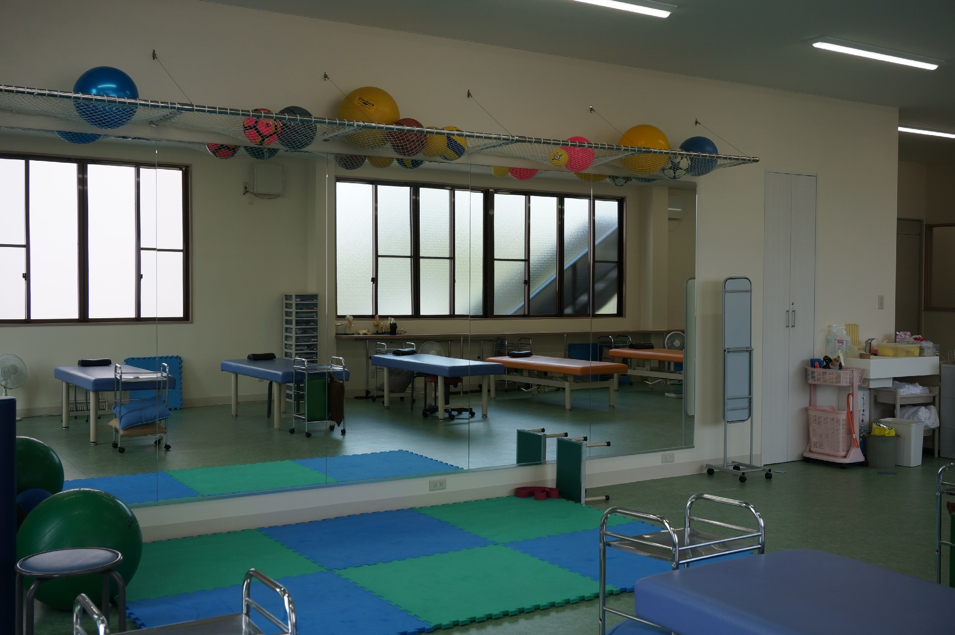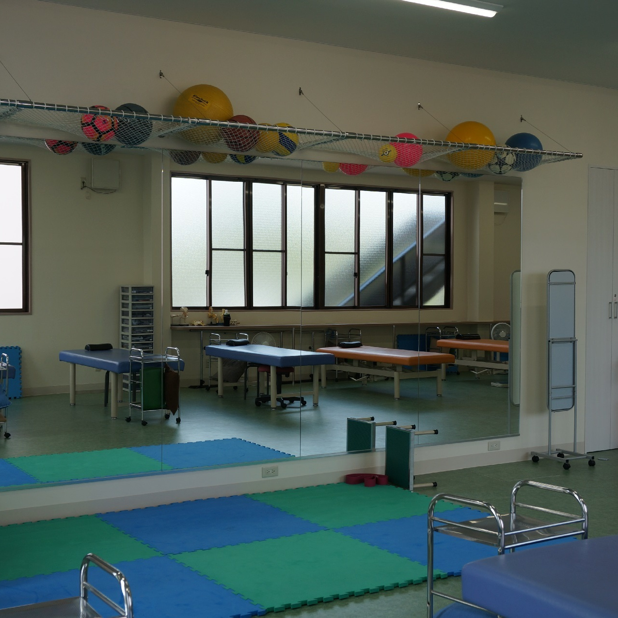 動きの確認が出来るように壁面一杯にミラーを設置し、上部にはリハビリで使うボールを収納するネットを設けています。