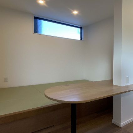 リビングの一角には小上がりのタタミコーナーを設け、収納兼椅子としてスタディスペースとしても活用できるようにしています。