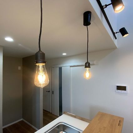 LDKは2階に設け、ダイニングの上部には勾配屋根の形状を活かした吹き抜けとして、広がりを持たせています。