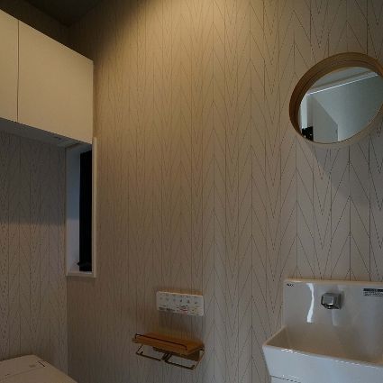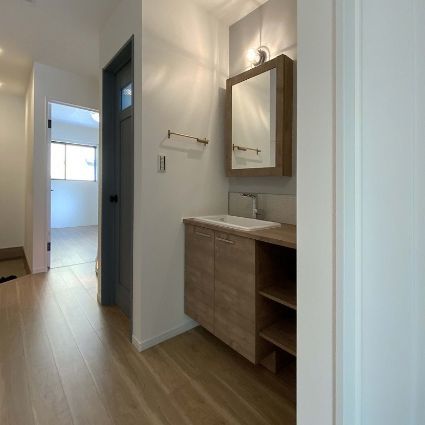 帰宅後すぐに手を洗うことが出来るように、玄関ホールに面してオープンな洗面コーナーを設けています。