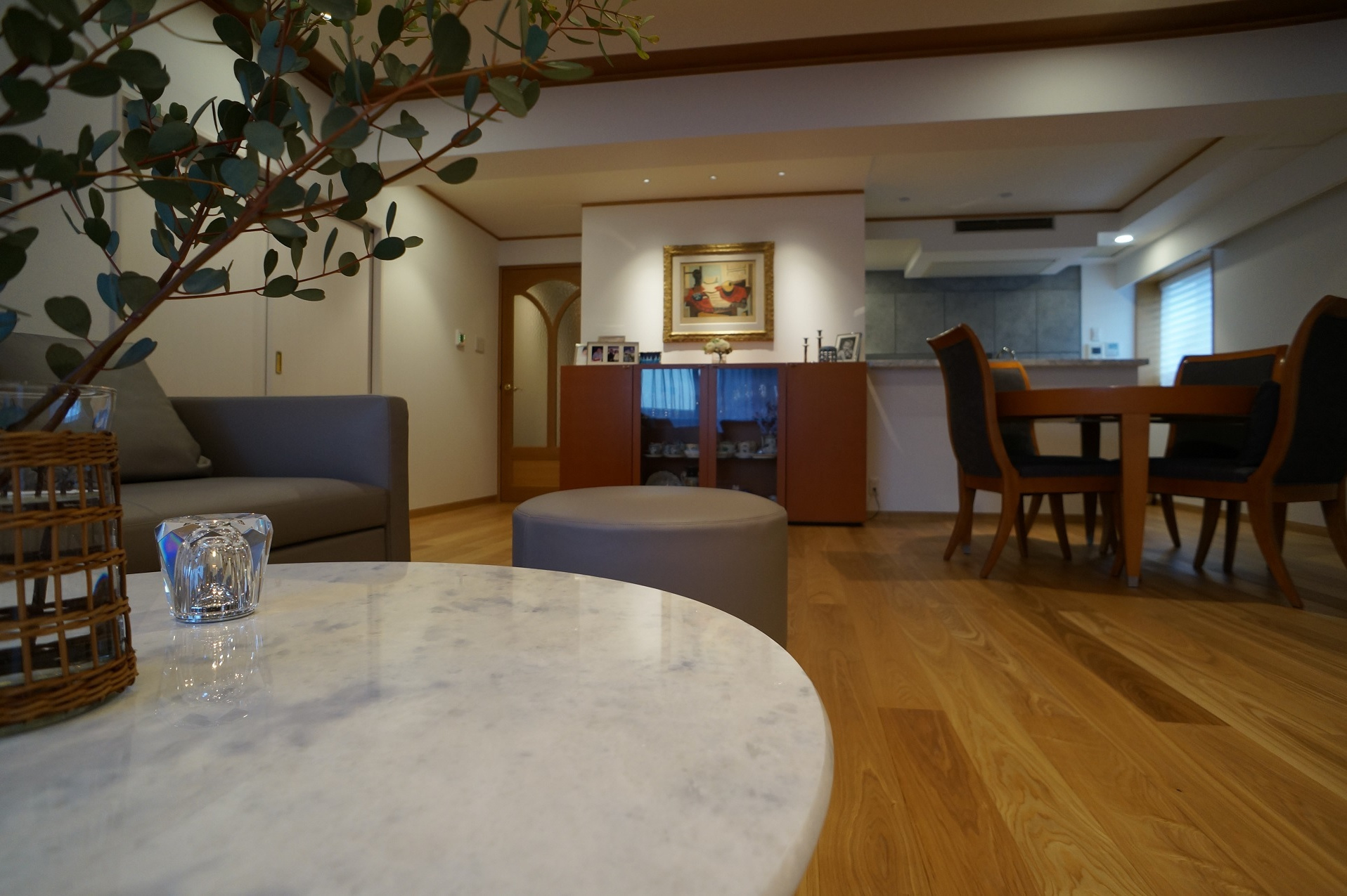 閉鎖的だったキッチンをオープンキッチンとし、隅に追いやられていたダイニングをリビングとの間に設けて、LDKを一体空間として広がりのある空間へと変えています。