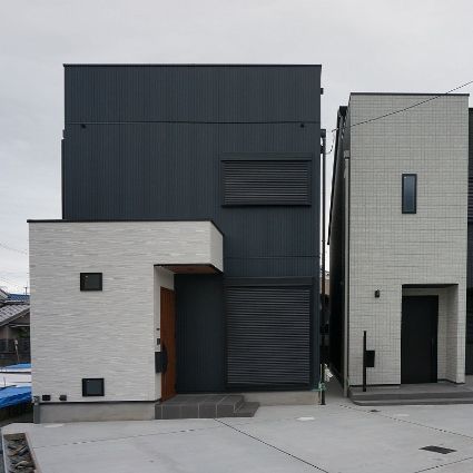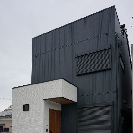 外壁は濃紺をベースとし、玄関廻りをホワイトでアクセントとしています。