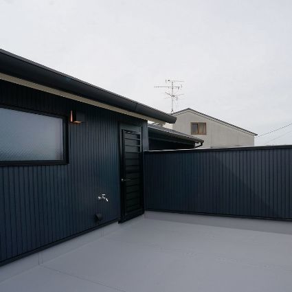 屋上部分の手摺り壁は少し高めに設定し、座った状態ではお互いの視線がささないように。この高さによりプライベート感の高い開放的な空間としています。