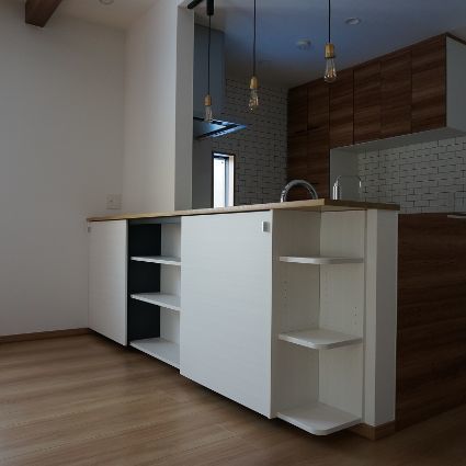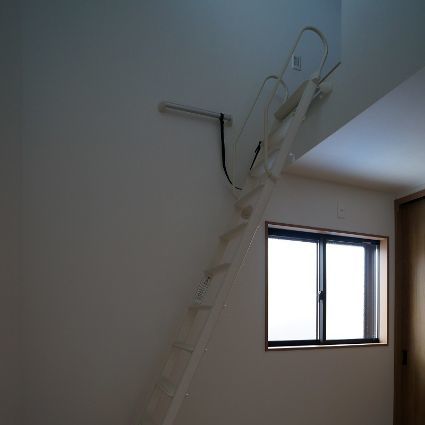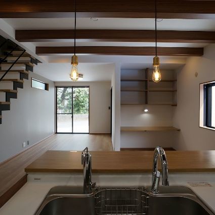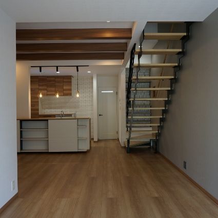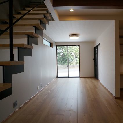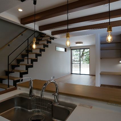 LDKを1階に設け、階高を少し高くすることで、圧迫感を軽減。LDKに設けた階段は、ご主人様の希望で鉄骨のスケルトン階段としています。