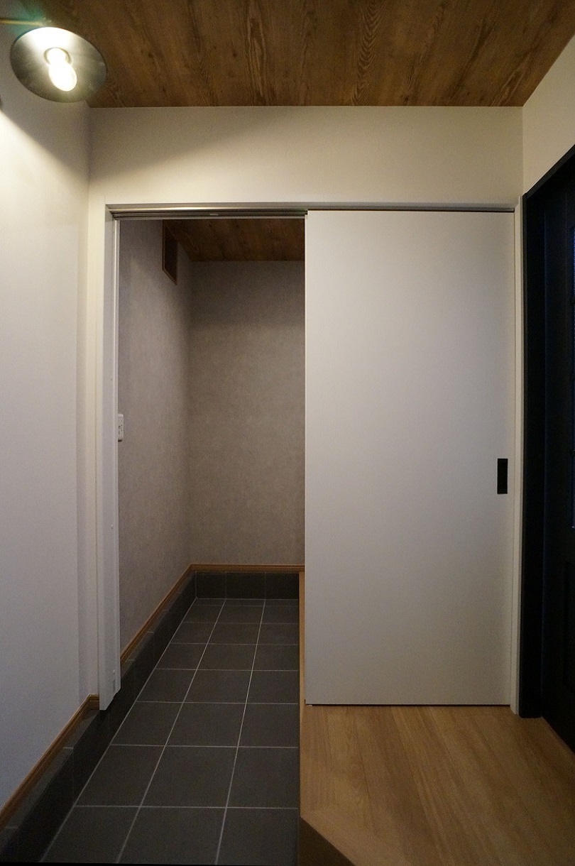玄関扉と軒天を木目調とすることで柔らかな雰囲気に。