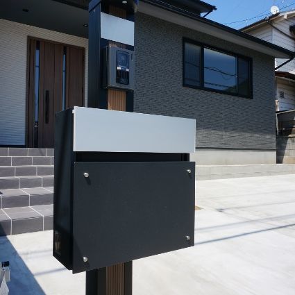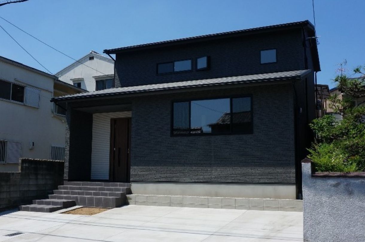 外壁は黒を基調としながら、玄関部分のみアクセントとして白にしています。